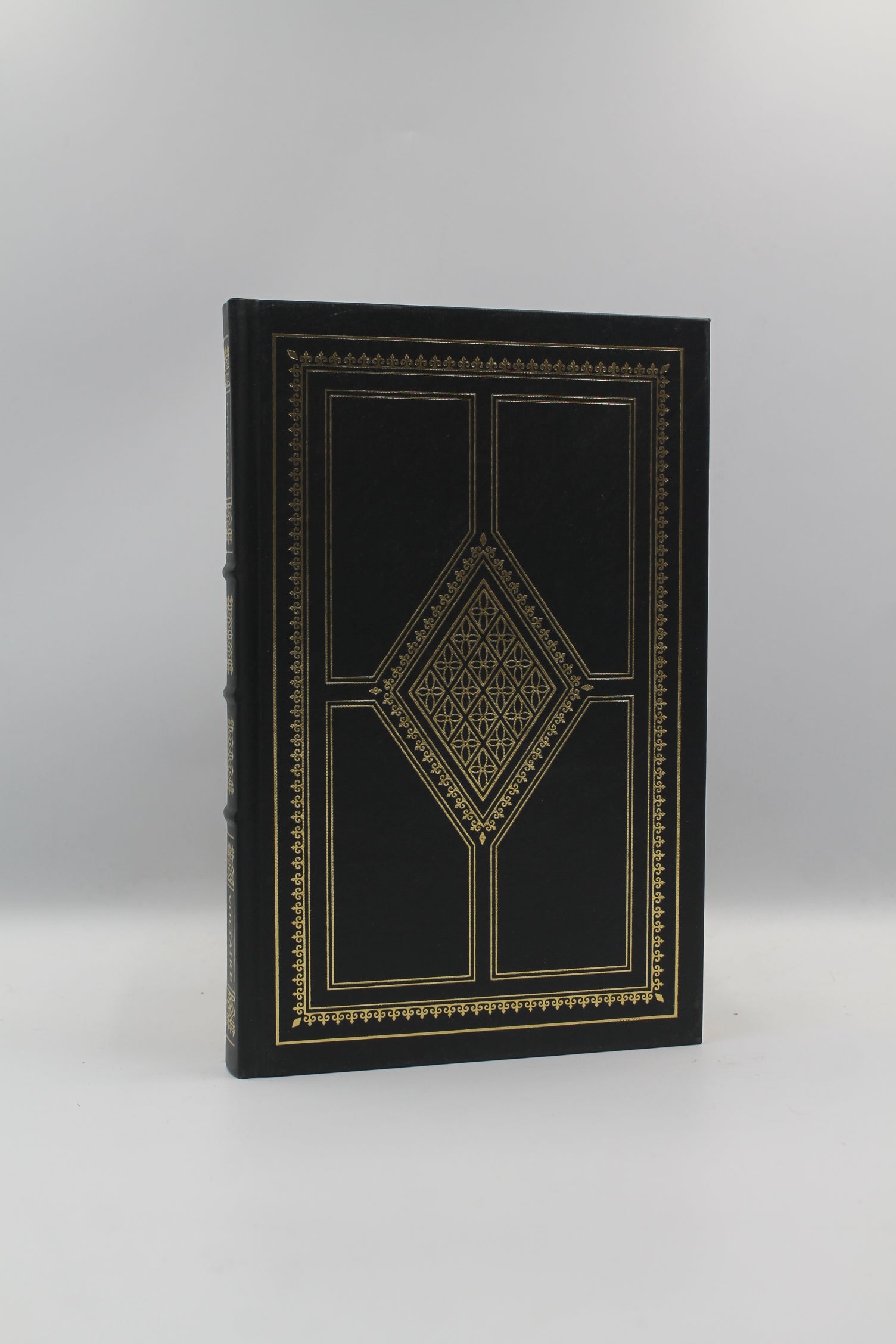 Tight, square binding. Likely unread with clean text block. Gold gilt edges. Bound in full midnight black leatherette lettered and decorated in gilt, raised spine bands. Decorative end pages.