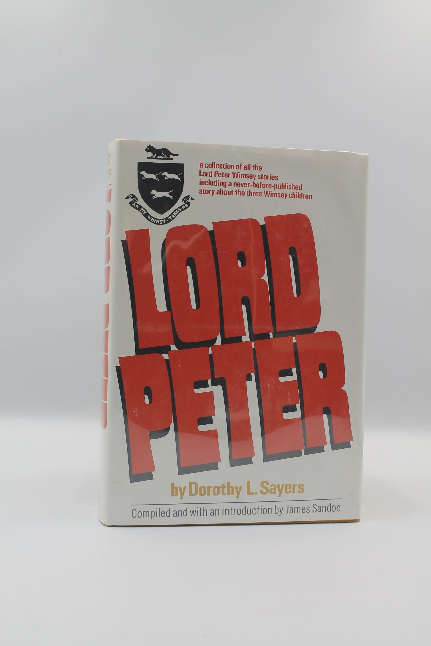 All of the Peter Whimsey stories in one volume. Compiled and with an introduction by James Sandoe. Inclues an essay on Sayers by Carolyn Heilbrun adn E.C. Bentryly famous parody, "Greedy Night." Unclipped dust jacket now wrapped in protective Brodart. Publisher's yellow cloth with author's name in black, title in red on spine. Clean text and interior. Red end papers. Clean text and interior.
