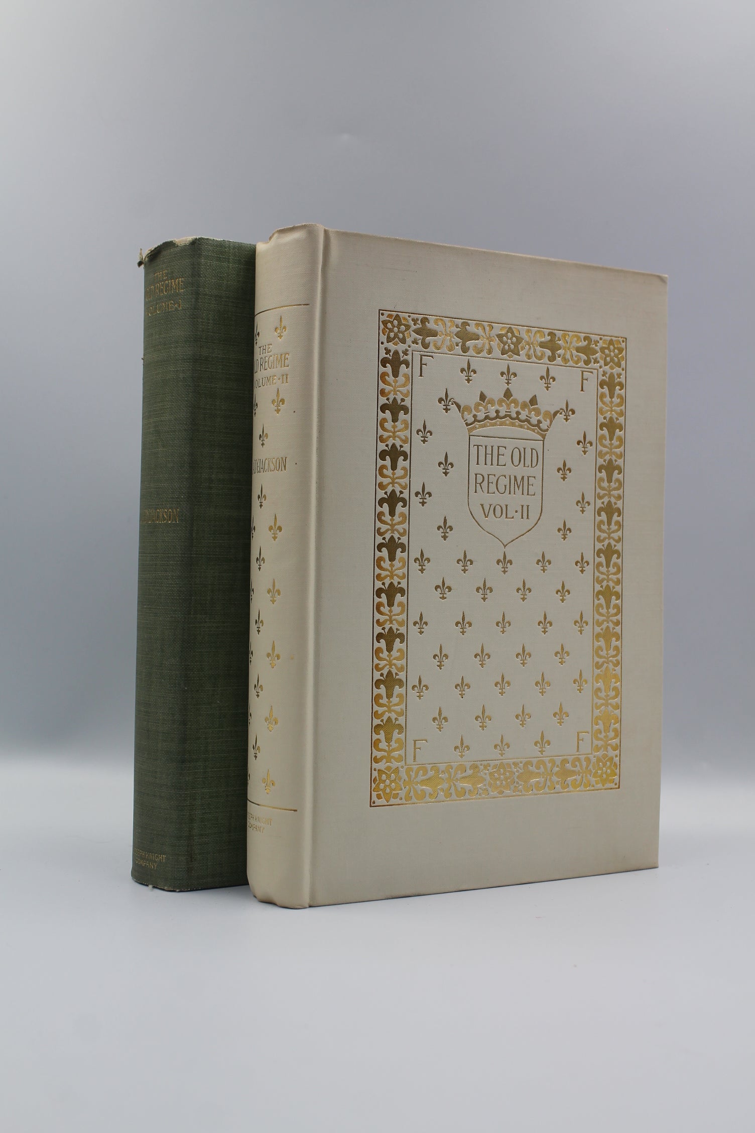 Complete two volume set. A book about the lived experiences of France's cultural elite during the era o fLouis XIV's selfish piety White cloth with decorative gold gilt on front cover and spine. Gold gilt top stain; other edges uncut. Stiff green dust jacket with gold gilt title on spine. Clean interior. Tight, square binding. Black and white frontispiece and illustrations throughout, each with clean tissue. 10/250 Large paper edition limited to 250 copies. Previous owner's book plate on interior cover. Some fraying top edge of each spine jacket.